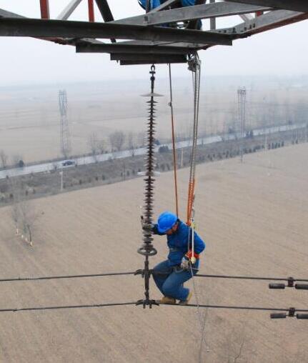 電力設(shè)施檢修電力工人攜帶鋁合金手扳葫蘆檢修作業(yè)...
